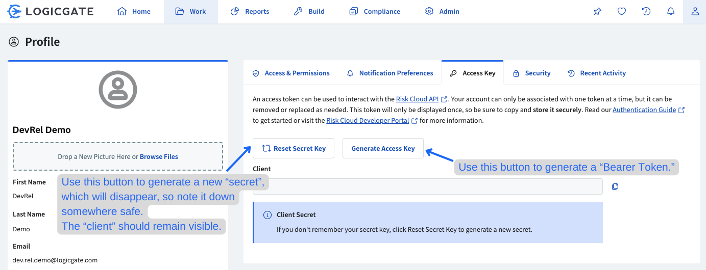 In the Profile page, go to the Access Key tab. If this tab is not there, please contact your Risk Cloud administrator as you may not have API privileges.